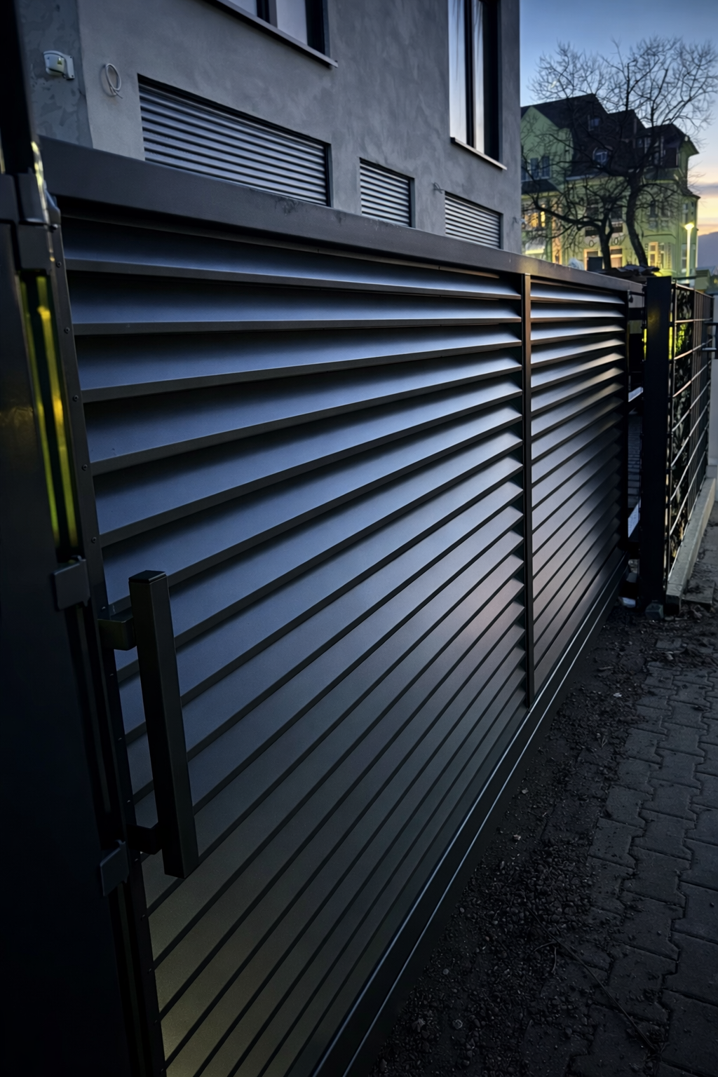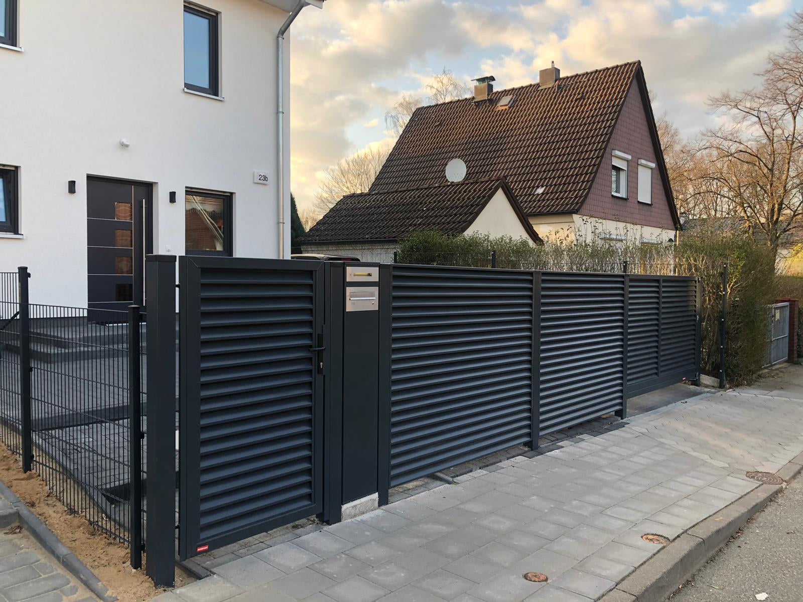 Das Einfahrtstor Hannover ist Teil unserer Premium Serie und wird individuell für Sie auf Maß angefertigt. Das Torsystem wird aufgrund der charakteristischen Lattenaufstellung oft auch "Jalousie" genannt. Unser Modell Hannover gewinnt zunehmend an Popularität, denn dank seiner unkonventionellen und modernen Stilistik hebt es sich von vielen Grundstücksbegrenzungen hervor. Dank der speziellen Kombination aus ALUZINK-Blech und der Pulverbeschichtung bietet es langjährigen Korrosionsschutz. Zugleich bietet es dank seiner geschlossenen Optik 100% Sichtschutz und Privatsphäre. Dieses Schiebetor ist Teil unserer Premium-Serie "Hannover" und wird hervorragend durch unsere Zaunelemente und Pforten ergänzt.